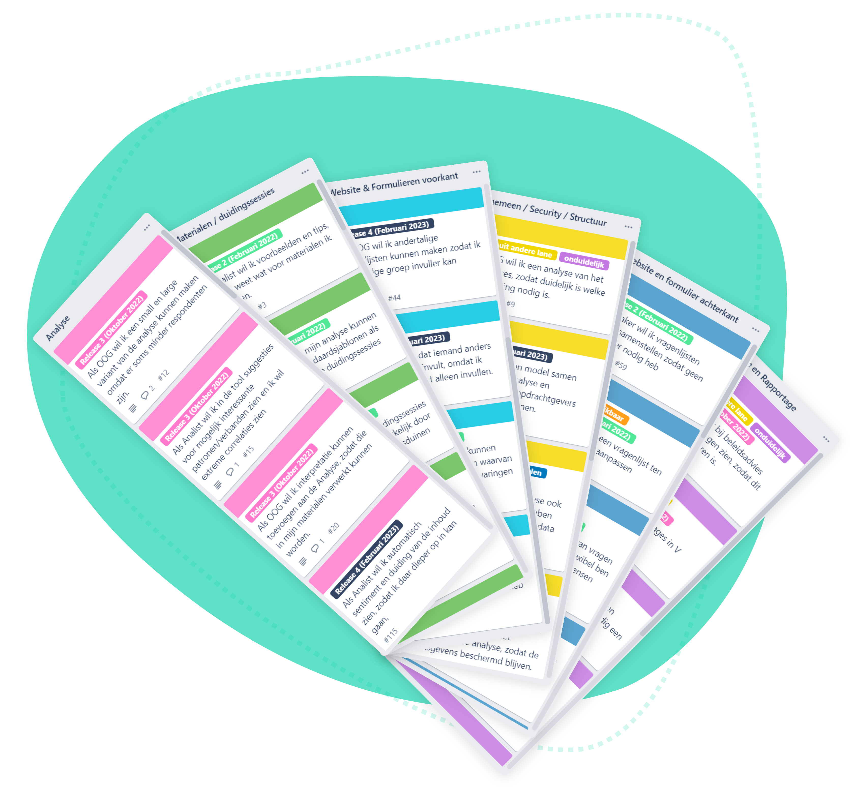 I made four Trello columns, each one contained a scoped portion of the application. I transcribed every sticky-note to a Trello card and placed it in the correct column. Luckily I got a lot of help with this. We removed duplicates, rewrote a few things and determined the priority of the stories. We used labels with release dates to do so. This resulted in user stories sorted in four releases.